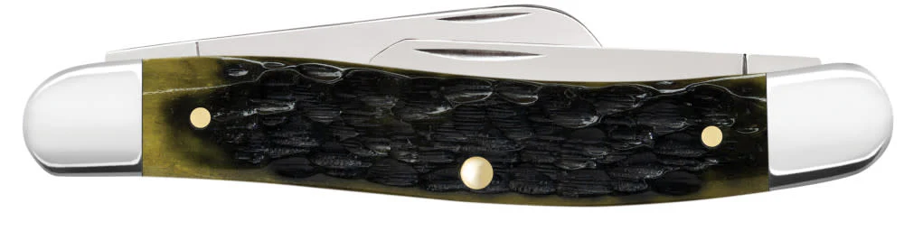 - Standard jigged Olive Green Bone handle; Embellished pocket end bolster